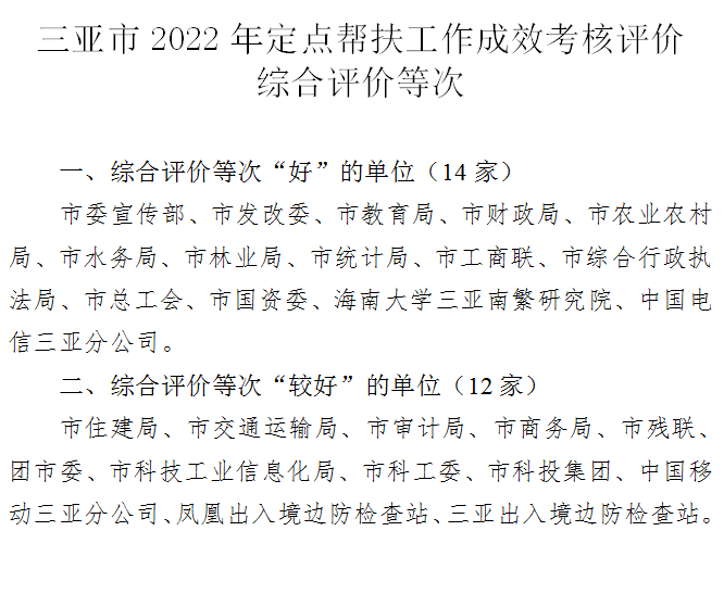 三亚市2022年定点帮扶工作考核成效考核评价综合评价等次结果如下: