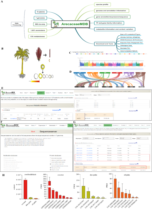目前,油棕、椰枣、椰子等棕榈科植物基因组被相继破译,并随之产生了大量的组学数据,但该领域的研究还没有整合的生物信息学数据库。罗杰团队联合合作单位在2021年发布了两个高质量椰子基因组,在此基础上,团队对油棕、椰枣、椰子、槟榔、省藤和黄藤六个物种的七个基因组数据、1,631个变异组数据,866个转录组数据及138个代谢组数据进行整合分析,并嵌入了12个常用的生物信息学分析工具,构建了棕榈科首个多组学综合分析平台ArecaceaeMDB (http://arecaceae-gdb.com)。