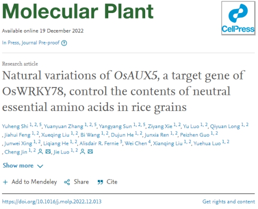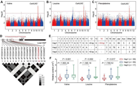 近日,入驻永利集团三亚南繁研究院的罗杰教授团队在Molecular Plant (IF=21.9)上在线发表题为“Natural variations of OsAUX5, a target gene of OsWRKY78, control the contents of neutral essential amino acids in rice grains” 的研究论文。该研究利用全基因组关联分析(GWAS)鉴定到控制水稻籽粒多种EAA积累的关键基因OsAUX5,为水稻营养品质改良提供了重要基因资源。