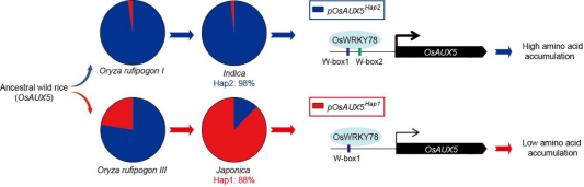 序列分析显示,大多数梗稻品种OsAUX5启动子区域都包含有一个18 bp的InDel序列插入,导致其上游调控因子OsWRKY78对OsAUX5 的激活能力变弱,进而导致梗稻品种中OsAUX5的表达量较低(图3)。作者对籼稻和梗稻OsAUX5等位基因(两个不同等位基因型)的分布和来源进行分析,发现粳稻的OsAUX5等位基因型来源野生稻(Or-III),而籼稻的OsAUX5等位基因型来自野生稻(Or-I),进一研究显示梗稻中的OsAUX5等位基因型受到了选择(图3)。将籼稻品种的OsAUX5等位基因引入粳稻品种中可以显著增加粳稻籽粒中EAA含量,同时不影响其它农艺性状表型。