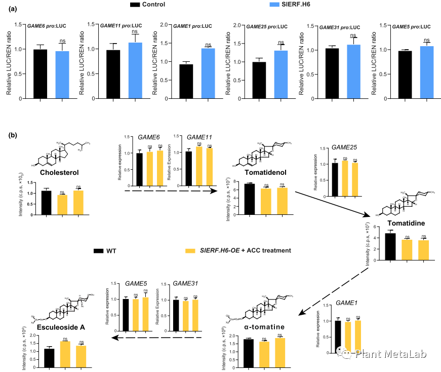 最近的研究表明,乙烯信号可以激活SlGA2ox的表达,导致生物活性GA含量降低。在该研究中发现在乙烯前体ACC处理削弱了SlERF.H6对GAMEs基因的调控作用。检测代谢物发现ACC处理下,SlERF.H6-OE材料中的SGA含量与野生型没有显著差异(图3)。综合以上结果SlERF.H6介导乙烯与赤霉素信号的相互作用进而调控番茄SGAs的积累。