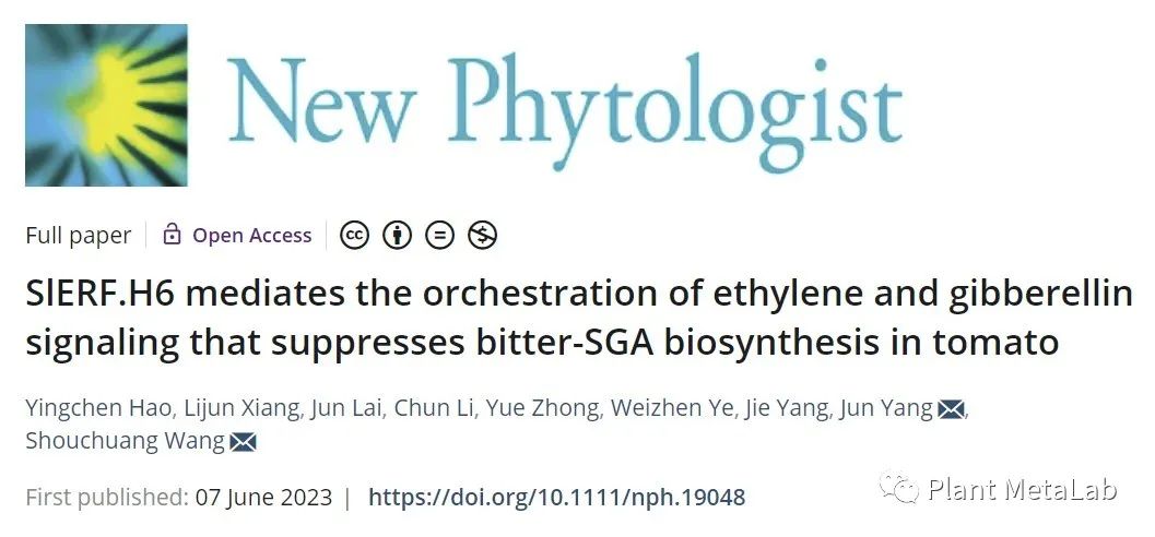 2023年6月8日永利集团热带作物学院/三亚南繁研究院王守创团队在国际学术期刊New Phytologist(中科院1区TOP,IF:10.323)上发表题目为“SlERF.H6 mediates the orchestration of ethylene and gibberellin signaling that suppresses bitter-SGAs biosynthesis in tomato”的研究论文。该研究使用正向遗传学,借助全基因组关联分析发现一个AP2/ERF转录因子SlERF.H6,解析了其在调节乙烯和赤霉素之间的串扰信号进而调控SGA生物合成中的关键作用。该不仅为解析SGA调控机制提供了新思路,也为人们采用多种技术来培育优良番茄品种奠定一定的基础。