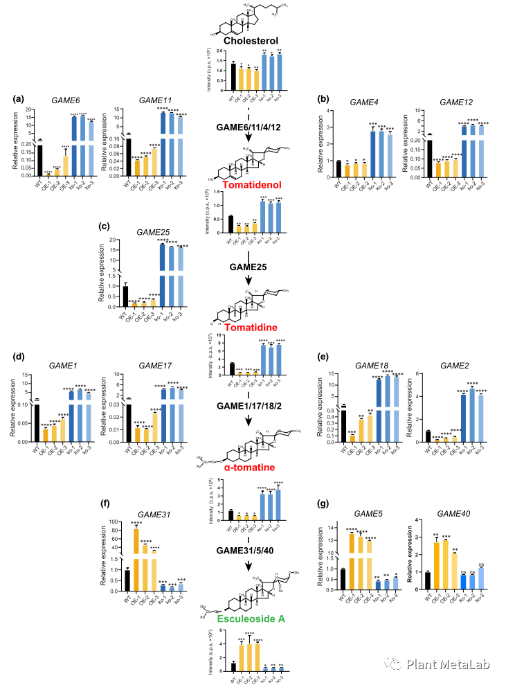 该研究对349份番茄材料的甾体生物碱类物质进行了检测,通过代谢物的全基因组关联分析(metabolite genome wide association study, mGWAS)定位到一个AP2/ERF转录因子SlERF.H6。为了验证该基因是否调控SGA的生物合成,构建该基因的转基因材料检测SGA代谢物含量变化(图1),发现在SlERF.H6-OE材料中苦味SGA含量降低;非苦味的esculeoside A含量上升,而在SlERF.H6-ko材料中结果相反;SGA合成通路上的相应GAMEs基因也呈现同样的变化,说明SlERF.H6参与番茄中SGA的生物合成并负调控苦味SGA的合成,促进非苦味SGA的生成。