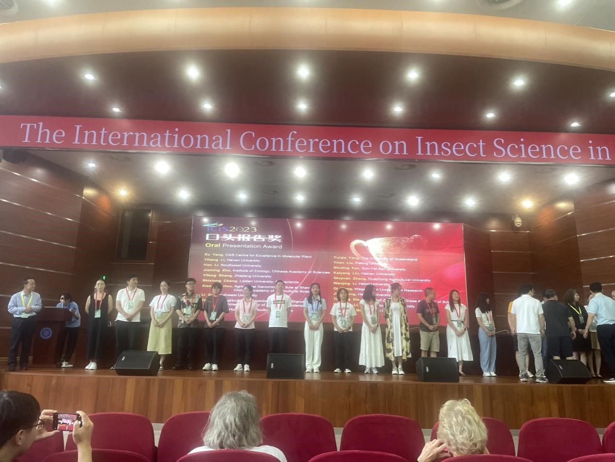 同时,吴少英教授团队将近期由教师李芬、张坤,博士刘凯扬、王力奎、金海峰涉及害虫神经电压门控钠通道、乙酰胆碱受体等抗性突变检测及功能验证的机理研究,能量转化膜控制害虫等绿色防控技术新方法等成果进行了汇报,研究内容丰富,报告逻辑清晰,得到了在场专家和同行的一致认可,其中博士研究生刘凯扬获得“Best Oral Presentation”奖。