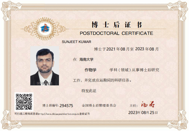 热带特色蔬菜产业技术创新与服务团队Sunjeet Kumar博士顺利完成博士后出站程序,并取得博士后证书。Sunjeet Kumar博士在团队从事博士后工作期间,以永利集团为第一单位在国际期刊发表高水平SCI论文6篇,其中中国科学院一区5篇、二区1篇,另有3篇文章正在进行投稿工作。Sunjeet Kumar博士已被永利集团聘任为高层次人才,出站后将作为正式员工加入该团队。