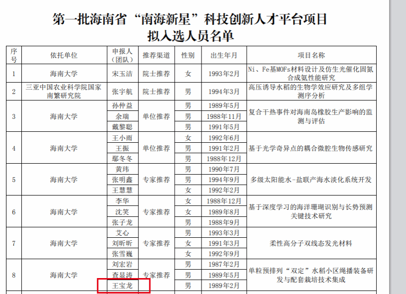 1、热带瓜类作物种质资源创新利用团队核心成员入选第一批海南省“南海新星”科技创新人才平台项目等