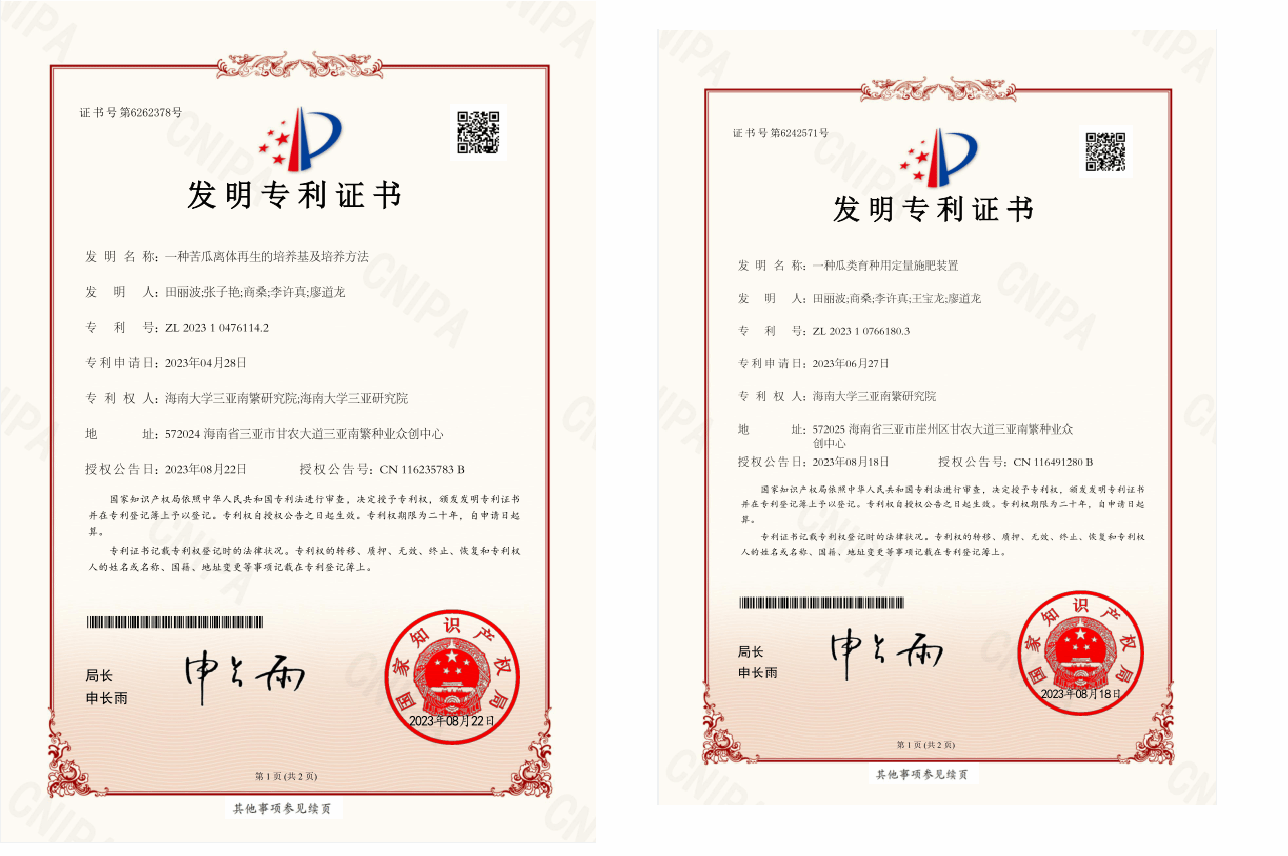图15. “一种苦瓜离体再生的培养基及培养方法”、“一种瓜类育种用定量施肥装置”国家发明专利授权证书