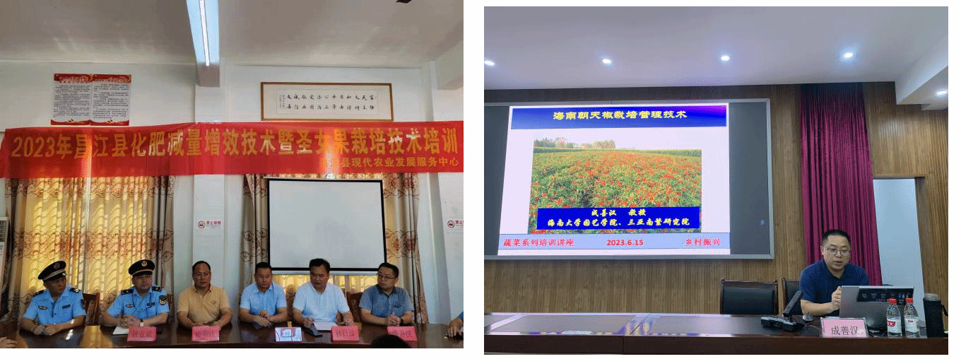 应昌江县现代农业发展服务中心邀请,永利集团三亚南繁院辣椒生物学团队成善汉教授分别于2023年6月15日、8月10日在昌江欧兰德毛豆南繁产业园、十月田镇姜园村面向基层农技人员、姜园村圣女果种植户开展了辣椒、圣女果关键种植技术培训,从辣椒产业趋势、种类与品种选取、水肥管理与主要病虫害防控,圣女果嫁接苗判别方法、果实增甜措施、降低裂果问题、增强病毒病抗性等方面分享了技术经验,并对新《种子法》与与会人员进行了解读,136人次人员参与了培训。