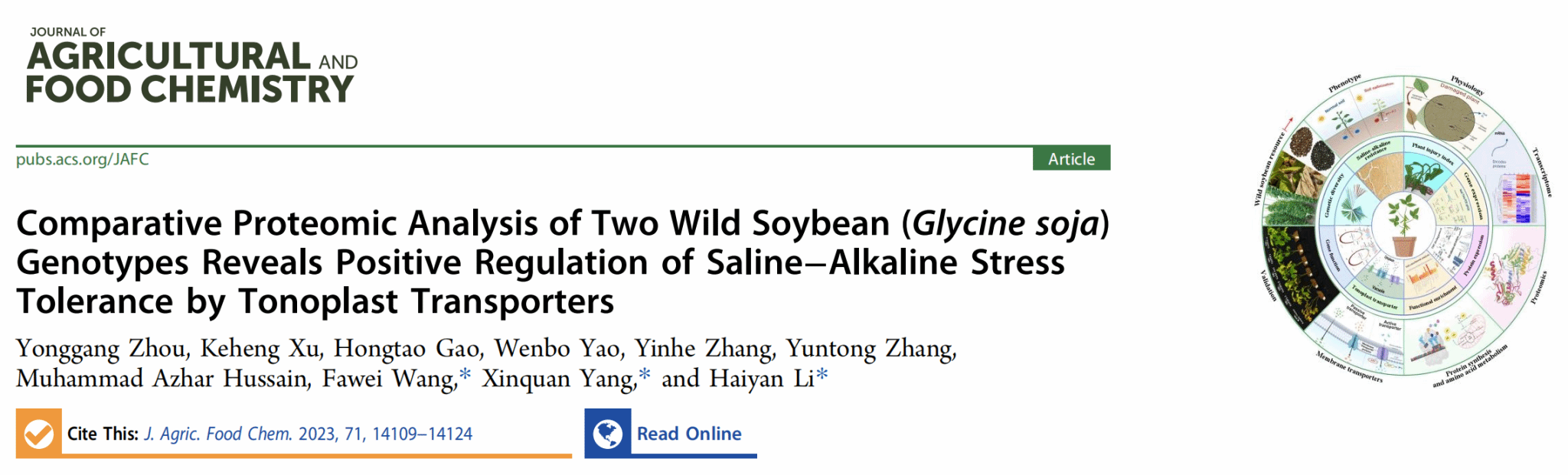 2023年10月yl9193永利集团李海燕教授团队在国际学术期刊Journal of Agricultural and Food Chemistry (中国科学院1区TOP,IF:6.1)上发表“Comparative proteomic analysis of two wild soybean (Glycine soja) genotypes reveals positive regulation of saline-alkaline stress tolerance by tonoplast transporters”的研究论文。该研究通过对125份不同地区来源的野生大豆盐碱耐受性的鉴定,并借助蛋白质组学分析的方法,分析发现氨基酸代谢、蛋白质合成和液泡膜转运蛋白形成了一个复杂的反馈网络,并影响大豆的盐碱胁迫耐受性。同时,重点研究了差异表达的液泡膜转运蛋白(GsTIP2-1、GsTIP2-2、GsINT1、GsSUC4和GsACA11)参与大豆耐盐碱调控的相关功能,以解析大豆在盐碱胁迫下的潜在分子调控机制。该项目的研究一方面为深入探索大豆盐碱耐受性的分子机制奠定基础;另一方面也为利用分子育种手段培育耐盐碱大豆新品系提供候选基因及新思路。