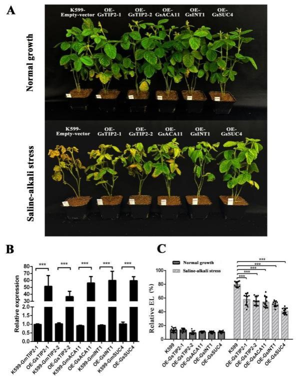 图3. 盐碱胁迫下过表达液泡膜转运蛋白对大豆复合体植株的表型鉴定
