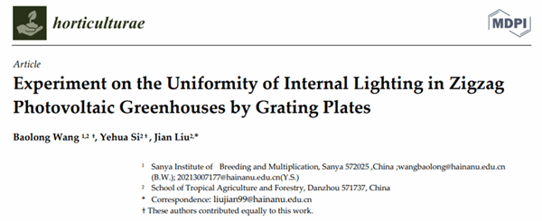 2024年3月,热带瓜类作物种质资源创新利用团队在JCR分区Q1—Horticulturae期刊发表题为Experiment on the Uniformity of Internal Lighting in Zigzag Photovoltaic Greenhouses by Grating Plates论文,研究采用光栅板做透光组件改善锯齿形光伏温室由于光伏组件遮挡引起的低光照区域内明暗带交接地区的光照均匀性,同时从透光材料对光路特征的利用来改善光伏温室内光环境提供思路。