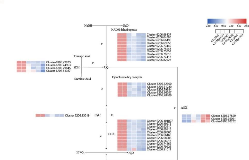 叶面钙镁混合营养处理提高细胞色素氧化酶(COX)基因的表达量而提高细胞色素呼吸途径(CP)关键酶COX活性,进而提高CP呼吸速率,减缓了CP途径呼吸速率的下降;同时,叶面钙镁混合营养处理也通过抑制交替氧化酶(AOX)基因表达而抑制AOX活性,进而抑制抗氰呼吸途径(AP)速率上升(图1)。因此,叶面钙镁混合营养处理通过促进CP而抑制AP,进而延缓果肉衰老进程,其应为叶面钙镁混合营养处理克服‘妃子笑’荔枝果肉“退糖”现象的生理机制之一。