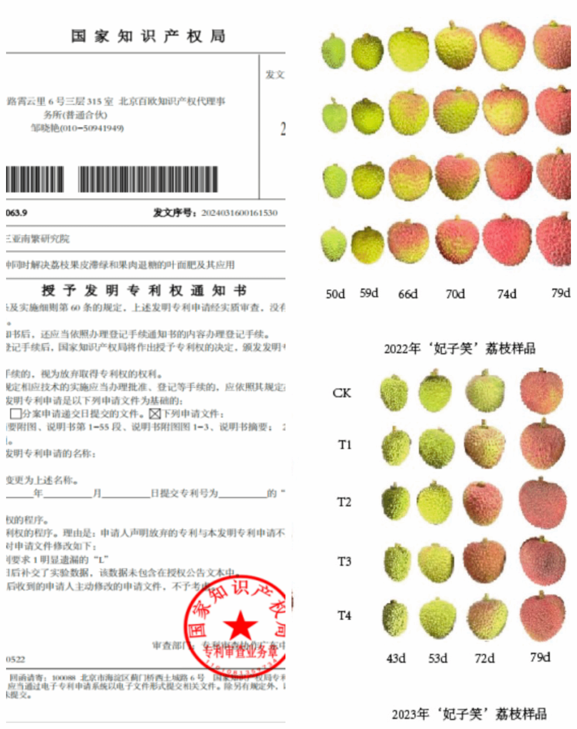 图. “一种同时解决荔枝果皮滞绿和果肉退糖的叶面肥及其应用”的专利授权通知书
