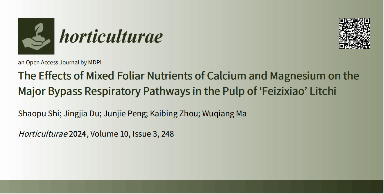该团队前期研究结果表明,在‘妃子笑’荔枝坐果后叶面钙镁混合营养能克服果实“退糖”现象,近期从叶面钙镁混合营养调节果肉主要旁路呼吸途径角度开展其机理研究,在园艺学主流国际期刊horticulturea(JCR/Q1)发表论文。