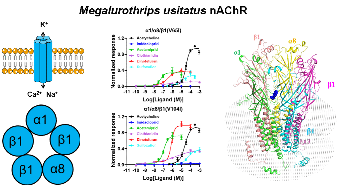 1)本团队利用双电极电压钳技术,首次对普通大蓟马烟碱型乙酰胆碱受体(nAChRs)进行体外纯合表达,并对抗性突变位点进行功能验证。首先已成功表达出具有活性的普通大蓟马α1/α2/α8/β1和α1/α8/β1 两种亚型nAChR。然后定点突变发现V65I使得吡虫啉、啶虫脒、噻虫胺、呋虫胺和氟啶虫胺腈对普通大蓟马α1/α8/β1亚型nAChR激动效果降低,V104I使得氟啶虫胺腈对普通大蓟马nAChR激动效果降低。最后通过同源建模和分子对接技术,进一步验证β1亚基的V65I介导普通大蓟马对新烟碱类杀虫剂和氟啶虫胺腈产生抗性。这项研究从分子水平阐明普通大蓟马对新烟碱类杀虫剂和氟啶虫胺腈产生抗性的分子机制,促进科研者对昆虫新烟碱类杀虫剂抗性机制的认识,为昆虫抗药性的治理和新型绿色杀虫剂的设计提供理论依据。