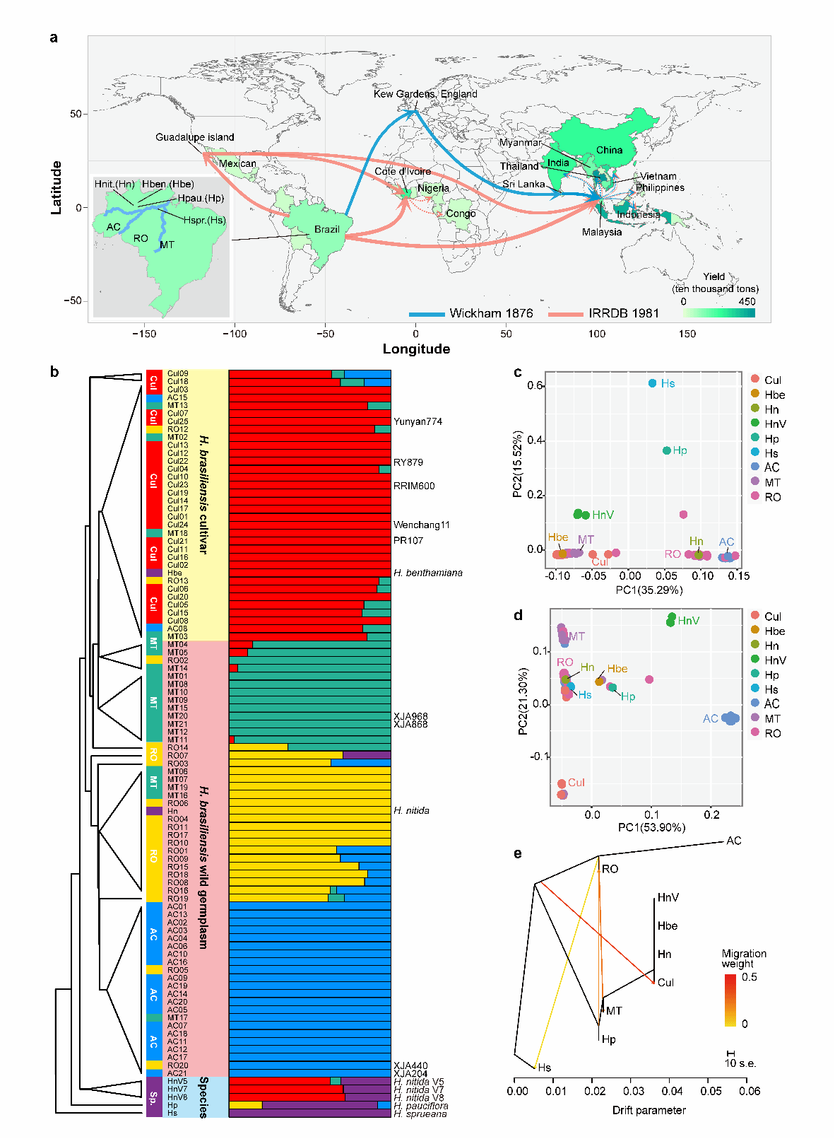 目前橡胶生产上的主要栽培品种均可追溯到来自橡胶树属(Hevea)巴西橡胶树(H. brasiliensis)种内的22株1876(年)魏克汉种质,遗传资源狭窄是橡胶树杂交育种进展缓慢的一个重要因素。同时,在橡胶树属的其他种,以及巴西橡胶树种内的野生种质中报道存在丰富的产胶、抗病、速生和耐旱等重要农艺性状遗传变异。但是,缺乏对不同类型橡胶树种质的亲缘关系、遗传多样性和基因流动等方面的系统研究。