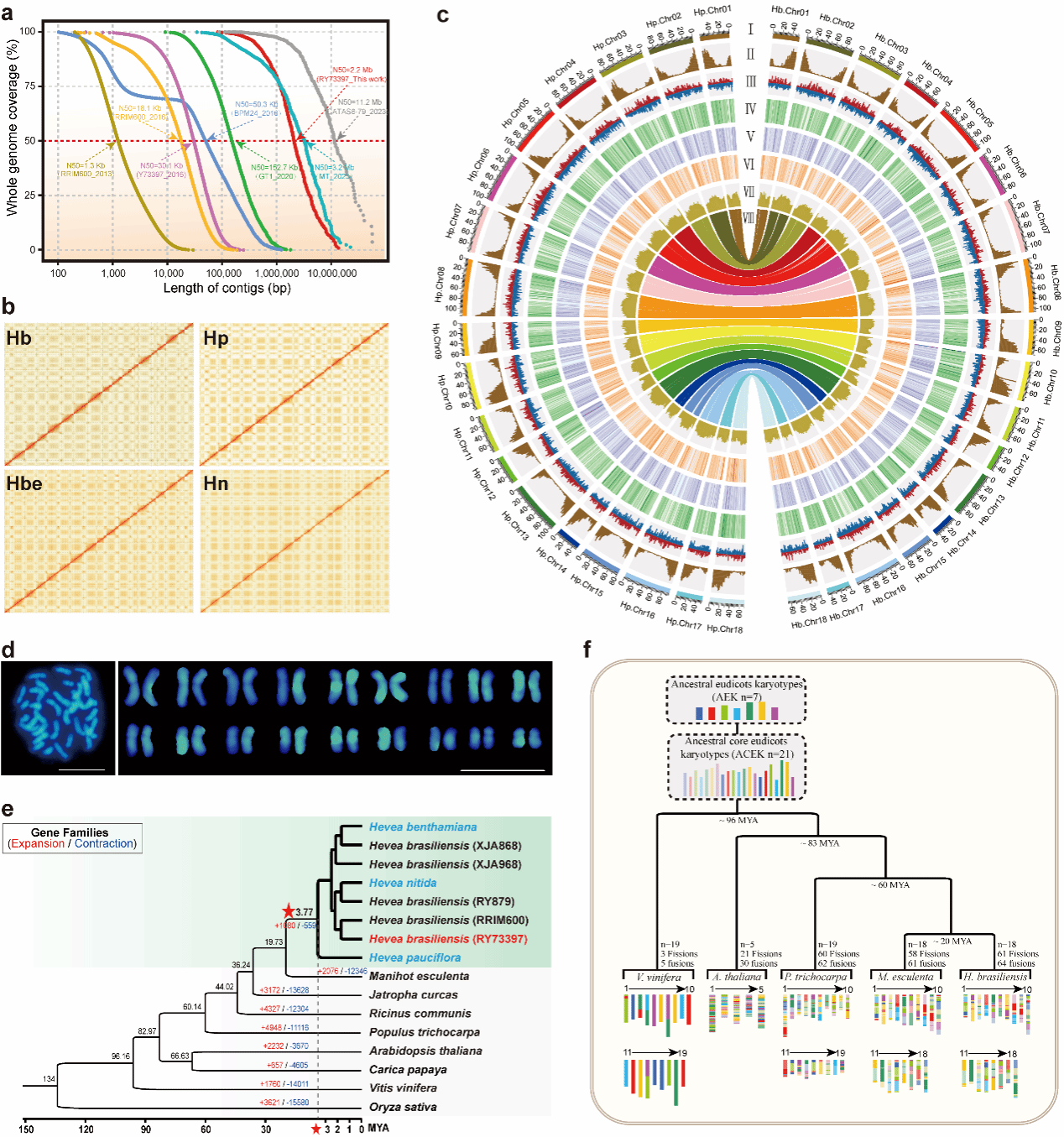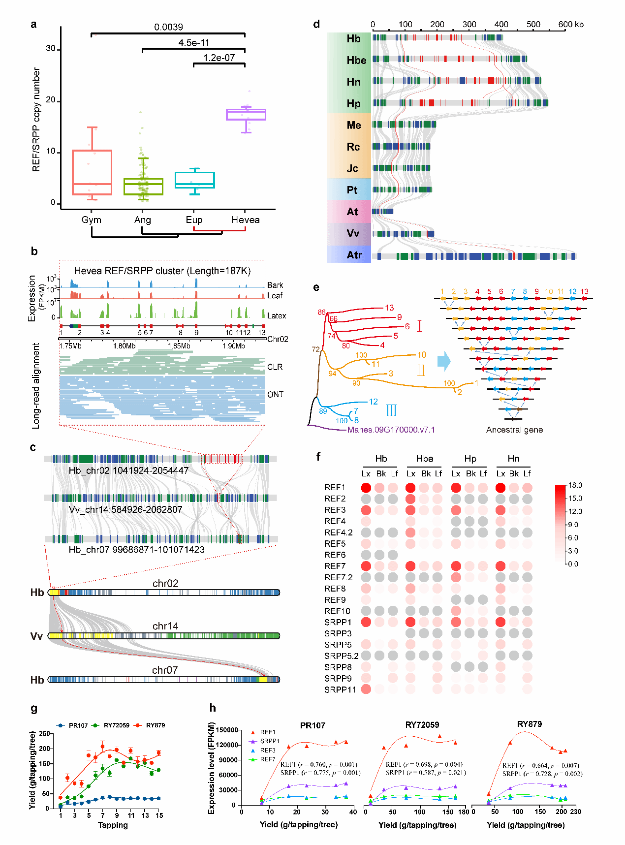 近日,yl9193永利集团产胶生物学团队联合中国热科院橡胶所、兰州大学等团队在Nature Communications上在线发表了题为“Pan-genome and phylogenomic analyses highlight Hevea species delineation and rubber trait evolution”的研究论文。研究阐释了目前世界主要产胶国保存的三类橡胶树种质资源的遗传结构和亲缘关系,并发现橡胶延伸因子/小橡胶粒子蛋白(REF/SRPP)大基因簇的产生,及其在产胶细胞乳管中的特异性功能分化是植物形成产胶这种抗虫性状的一个关键性进化事件。研究结果为进一步探究产胶性状的进化机制,加快橡胶树资源的高效利用和品种遗传改良提供了重要理论依据和资源支撑。