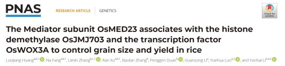 近日,yl9193永利集团与中国科学院遗传与发育生物学研究所合作,以永利集团为第一完成单位在《美国国家科学院院刊》(PNAS)发表题为“The Mediator subunit OsMED23 associates with the histone demethylase OsJMJ703 and the transcription factor OsWOX3A to control grain size and yield in rice”的研究论文,揭示了转录抑制复合体OsJMJ703-OsMED23-OsWOX3A调控水稻种子大小与产量的新机制。