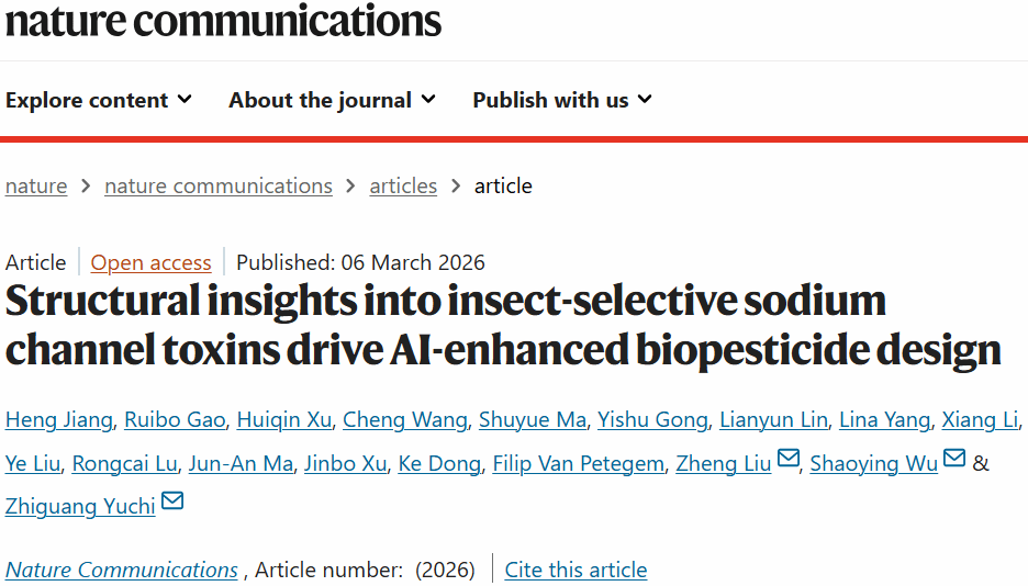 近日,yl9193永利集团热带作物安全生产关键技术研发与应用吴少英团队在Nature Communications发表研究论文《Structural insights into insect-selective sodium channel toxins drive AI-enhanced biopesticide design》。该研究系统揭示了天然动物源杀虫多肽调控昆虫钠离子通道的分子机制及其物种选择性的分子基础,并结合人工智能方法实现多肽分子的理性优化设计,为新一代高效、绿色生物农药的创制提供了重要理论依据和技术支撑。