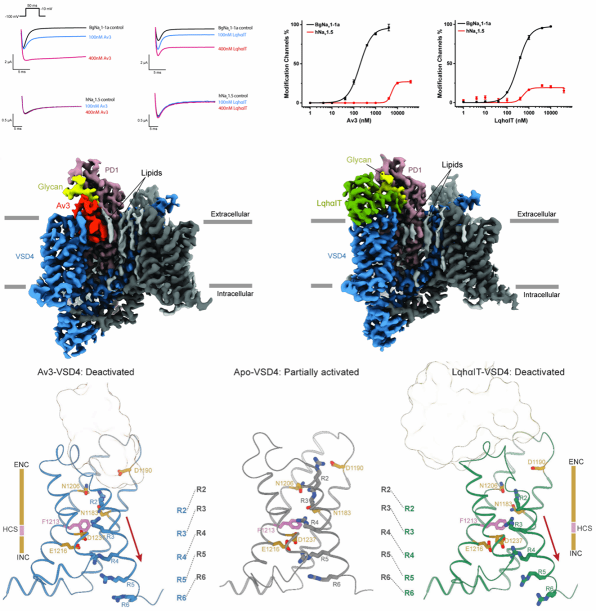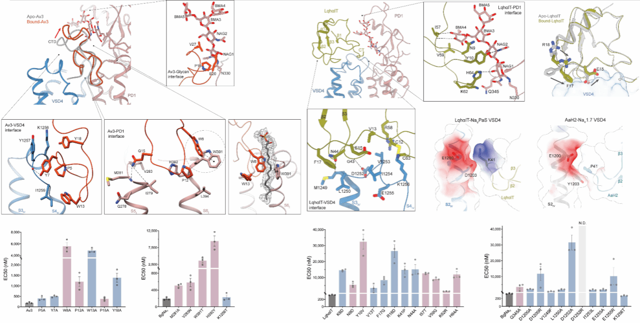 在本研究中,研究团队研究解析了两种天然神经毒素—海葵毒素Av3和蝎毒素LqhαIT—与昆虫电压门控钠离子通道的结构互作机制,并阐明其昆虫特异性杀虫作用。研究结果表明,海葵毒素Av3与蝎毒素LqhαIT能够显著调控昆虫德国小蠊钠离子通道BgNav1-1a,抑制通道快速失活。相反在哺乳动物钠通道hNav1.5中几乎不产生明显影响。电镜结果显示两种杀虫多肽主要通过作用于钠通道的第四电压感受结构域(VSD4),改变通道的构象状态,从而干扰其快速失活过程并持续影响神经信号传导。