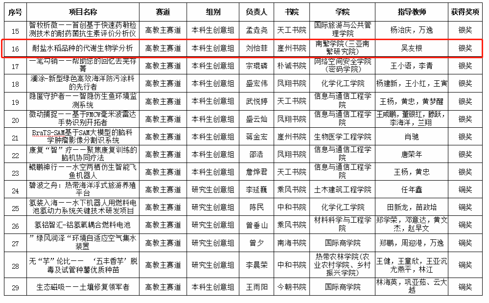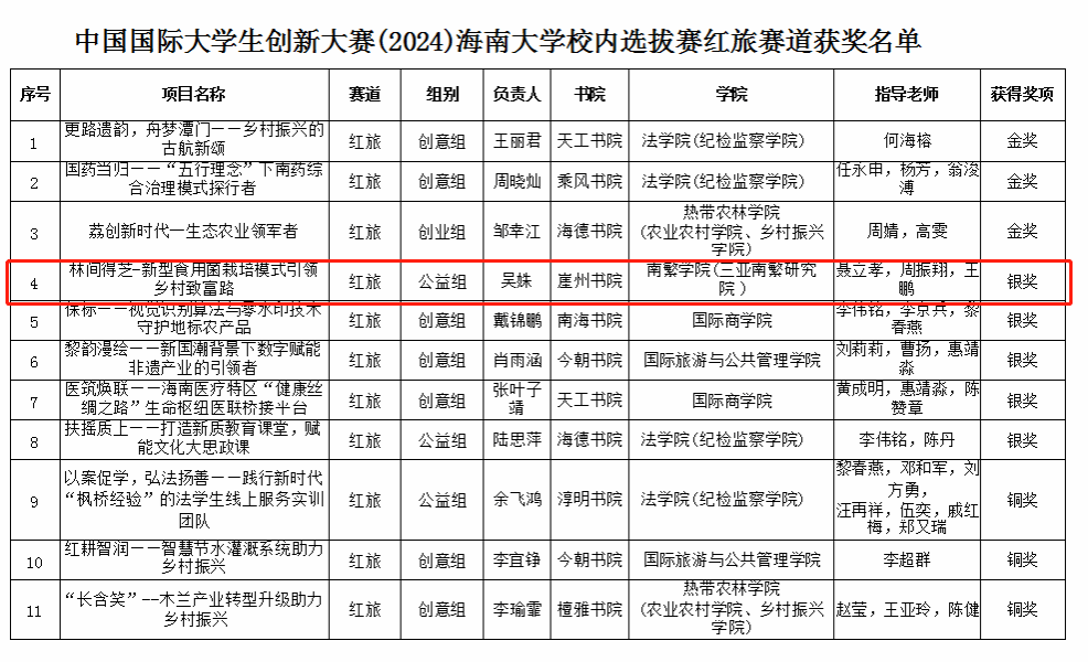 为贯彻落实党的二十大精神,统筹推进教育、科技、人才“三位一体”战略部署2024年6月24日,中国国际大学生创新大赛(2024)永利集团校内选拔赛顺利举办,经前期各学院评审推荐、专家网评、现场答辩多个环节,yl9193永利集团师生的参赛作品在学校众多队伍中脱颖而出,吴友根老师指导的“耐盐水稻品种的代谢生物学分析”荣获高教主赛道银奖;陈飞老师指导的“智慧之窗——海南热带雨林生物数据库平台”荣获高教主赛道铜奖;胡海燕老师、吴友根老师、杨小锋老师指导的“椰风海韵——海南油茶振兴计划”荣获高教主赛道铜奖;聂立孝老师、周振翔老师、王鹏老师指导的“林间得芝-新型食用菌栽培模式引领乡村致富路”荣获红旅赛道银奖。