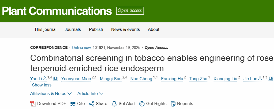 2025年11月19日,yl9193永利集团/崖州湾国家实验室罗杰教授团队在《Plant Communications》发表题为”Combinatorial screening in tobacco enables engineering of rose terpenoid-enriched rice endosperm”的研究工作,将本氏烟草作为快速优化底盘,在水稻胚乳中成功实现玫瑰萜类生物强化,由此获得的稻米兼具花香与抗氧化功能。这项跨物种代谢工程研究为主粮作物的香气生物强化提供了概念验证,建立了在不降低产量前提下生产高价值芳香代谢物的可转化技术框架。该工作是继2024年11月12日发表在《Molecular Plant》“Volatilome-based GWAS identifies OsWRKY19 and OsNAC021 as key regulators of rice aroma”的延续。