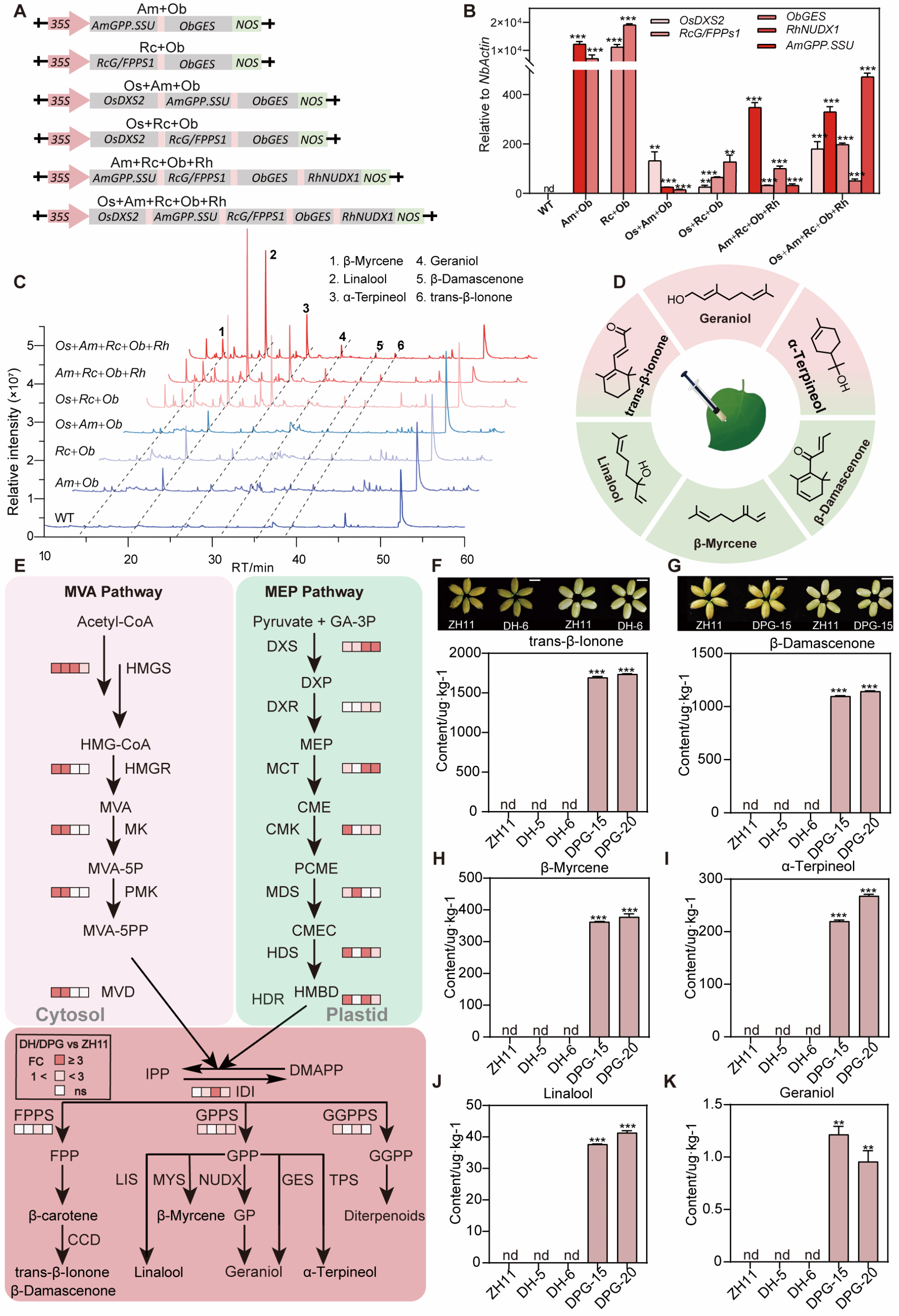 为应对全球危机下的粮食安全挑战,突破传统育种局限,并解决玫瑰萜类代谢物来源有限的问题,研究团队建立了一种高效的两步法作物香气生物强化策略。首先,系统分析玫瑰萜类合成途径(由MEP/MVA途径生成IPP和DMAPP前体,经GPP/FPP/GGPP合酶催化,进一步产生玫瑰富含的萜类化合物;其中GPP在GES和NUDX两种酶催化机制下生成香叶醇),由此确定玫瑰萜类化合物合成的5个关键基因。然后,通过本氏烟草体系大规模瞬时筛选,从16个基因组合中,鉴定到产生玫瑰萜类的最少3基因集(OsDXS2-RcG/FPPS1 -ObGES产量达2541μg/kg鲜重,媲美五基因集)。随后,用GB2.0技术及GluA2等胚乳特异性启动子创制3基因集转基因水稻,并在该水稻胚乳中检测到丰富的玫瑰萜类代谢物(最高1740μg/kg鲜重)。相比于ZH11,该品系抗氧化能力增强,加热释放花香,且农艺性状未受影响。未来有望通过将关键酶靶向至质体增强其表达、下调竞争途径等方式,进一步优化代谢流以提升产率。